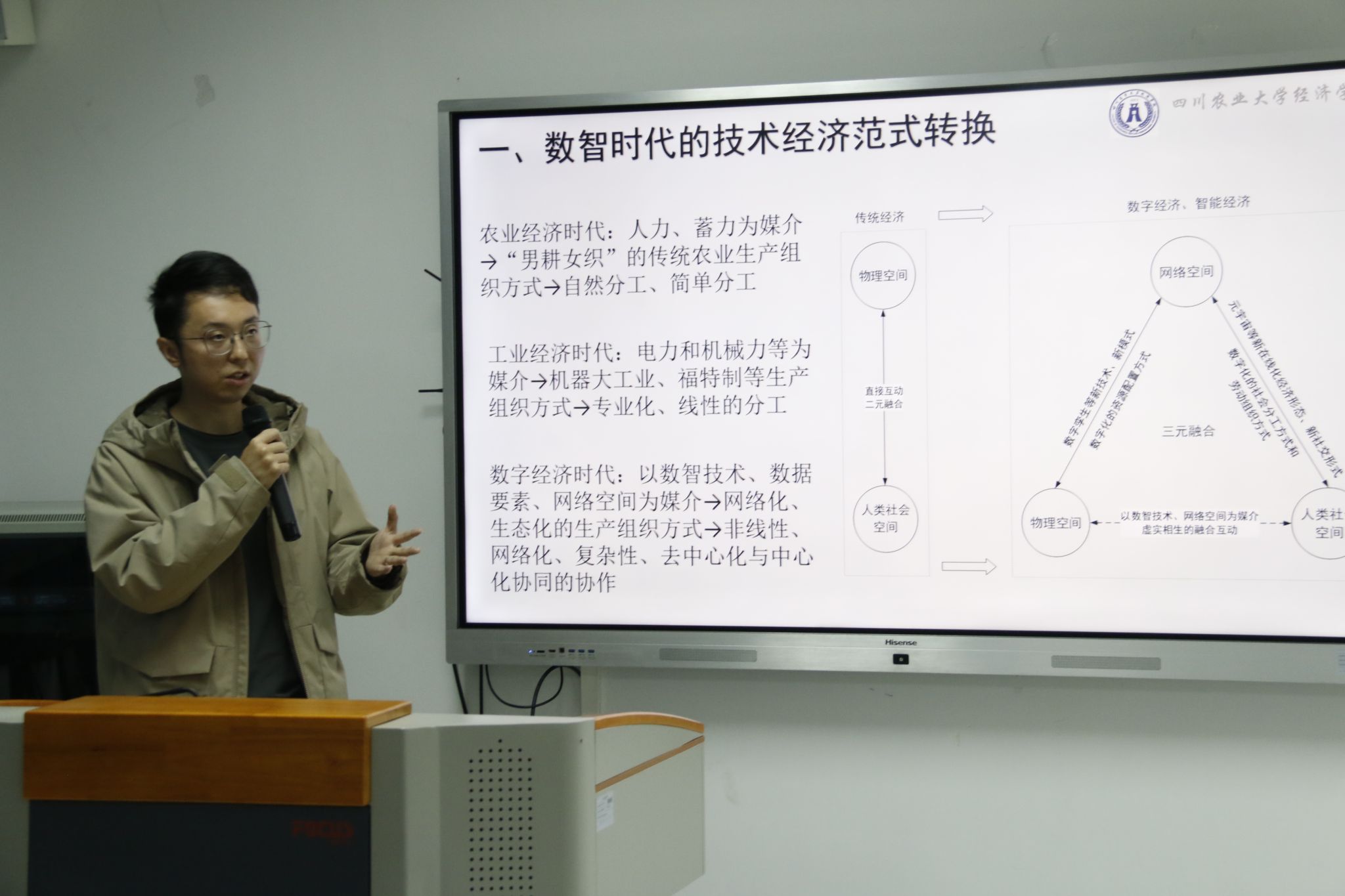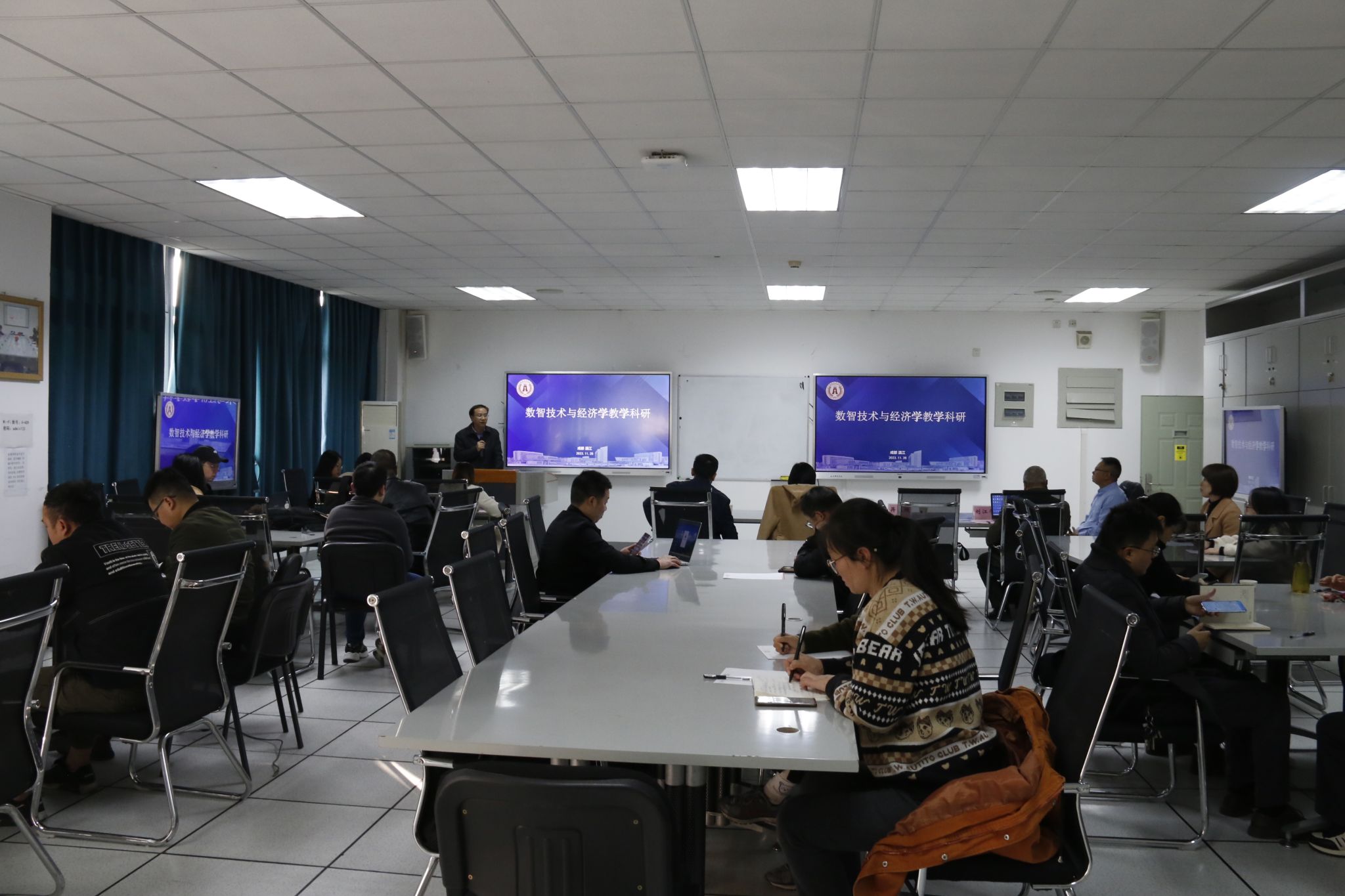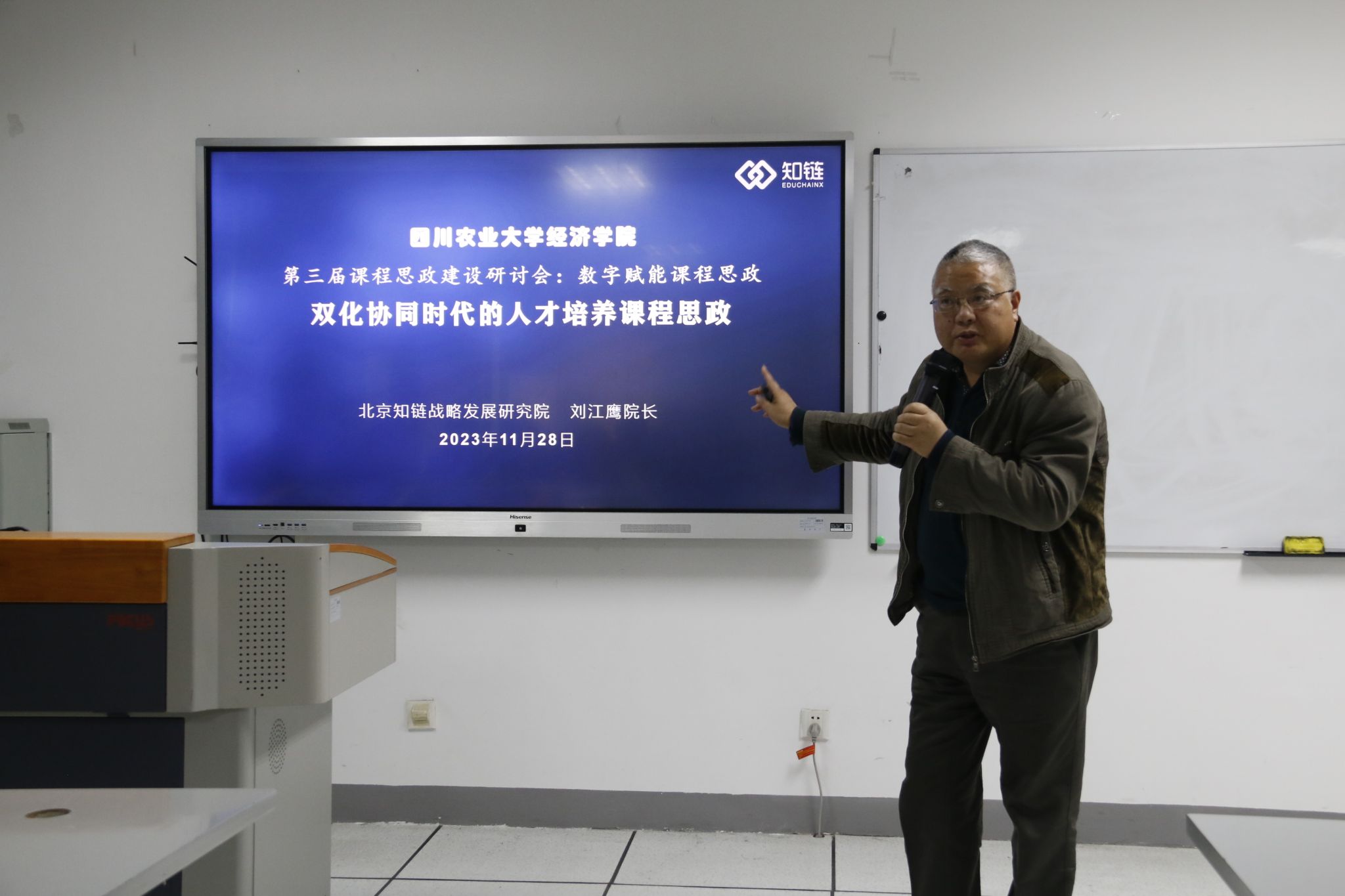 北京知链科技有限公司战略发展研究院院长刘江鹰开展《双化协同时代的人才培养课程思政》主题讲座。讲座围绕“双化协同”、“底层技术”和“区块链”等关键词展开,刘院长强调数字化、绿色化协同转型对经济学教学科研具有重要意义,他指出数字和法律素养的普及对我们教学工作具有很大的支持作用,数字化时代下课程思政的内容应当更加丰富和完善。