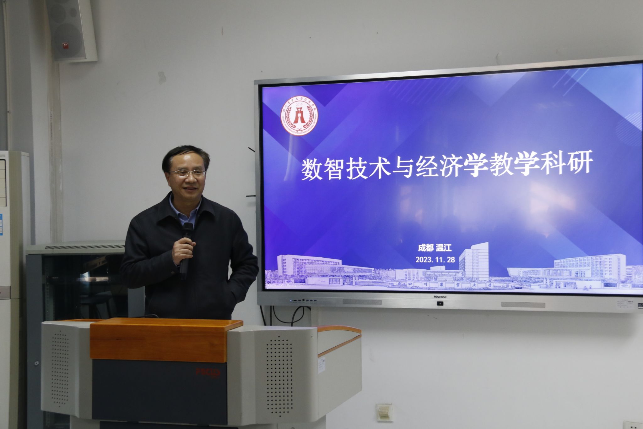 院长蒋远胜在致辞中指出,新一轮科技革命和产业革命背景下,数智化综合专业建设是新时代经济学科人才培养的大势所趋和现实需求,希望大家通过此次研讨会分享学科专业建设改革新经验,探索人才培养新路径,不断强化理念认知升级、师德师能建设、典型经验推广,从而引导、赋能课程建设,进一步提高科研能力、加强学术交流,促进经济学科的建设和发展。他强调,为了提升教学科研水平质量,必须要拥抱数字信息技术的巨大挑战,探索学科建设与人才培养之间的关系,用宏观视野去思考专业办学特色和人才培养定位,最终落实“立德树人”的根本任务,培养“厚基础、强技能、善整合、能创业”的高水平应用型经济学科人才,提高学生的社会适应性和职业能力的可持续发展。