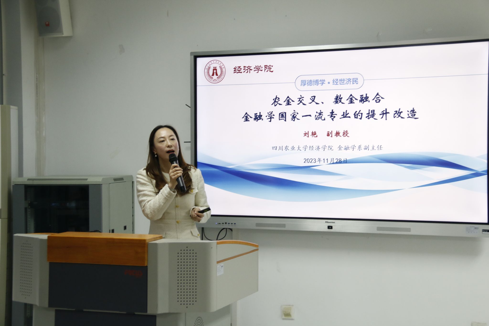 太阳集团刘艳老师开展主题为《农金交叉、数金融合——金融学国家一流专业的提升改造》的交流报告。刘老师提到教育强国背景下金融学专业建设的要求也应当与时俱进,教学内容既要与其他专业(如数学、计算机、法律)交叉融合,又要紧跟金融产业的发展。教学方式要更多运用数字技术和互联网平台,如MOOC、Spoc等。